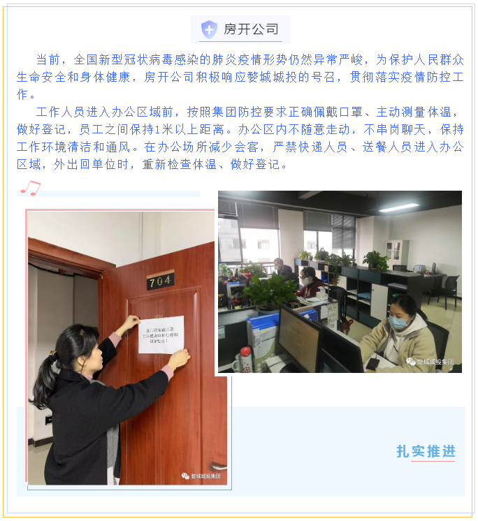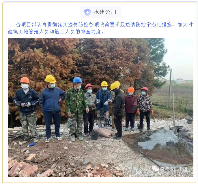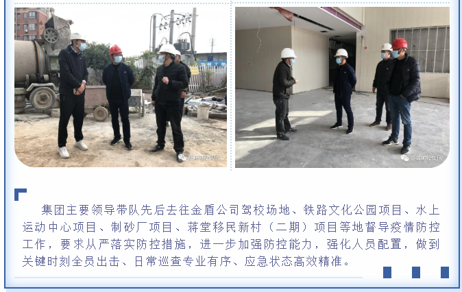 為貫徹落實省、市、區(qū)疫情防控工作視頻會議精神,婺城區(qū)城投集團全員行動,在集團疫情防控工作體系的框架下,分別以職能部門和子公司、項目為主體,制定切合實際、有操作性的疫情防控方案,同時組織紀檢專班力量,成立督查應(yīng)急小組,對各工地(項目)疫情防控措施設(shè)置情況進行督查督辦,集團上下全面緊起來、嚴起來,疫情防控工作氛圍濃郁。