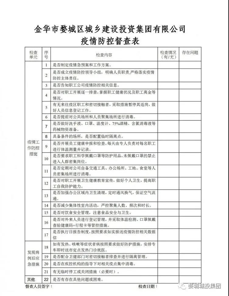 一是由集團疫情防控工作領(lǐng)導小組常務副組長陳中山牽頭成立督導檢查組,下設(shè)4個督查小組,督導小組成員放棄周末休息時間、不舍晝夜分赴在建工地、物業(yè)小區(qū)、文旅項目、高速路口、醫(yī)院門崗等重點區(qū)域督導檢查集團疫情防控工作落實情況,重點督導檢查領(lǐng)導批示指示要求、重點工作、防控措施和應急預案的落實情況,認真組織核查并及時報送防控核查信息。二是完善修訂《集團疫情防控規(guī)范及工作制度》、《集團疫情防控督查表》,明確工作職責、強化規(guī)范管理,確保督查效率。三是督促建立健全疫情防控臺賬,明確督查重點,狠抓任務落實。